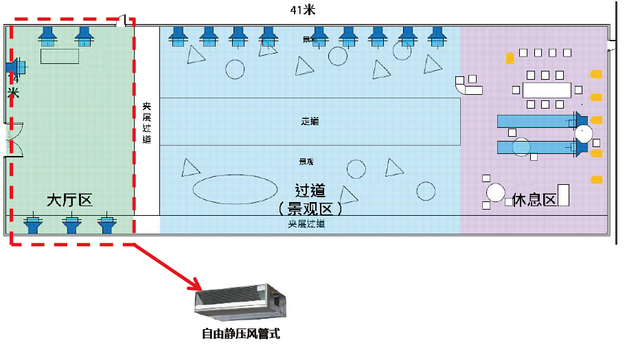 大廳區(qū):大金VRV,自由靜壓式(主)+明裝落地式(輔)
