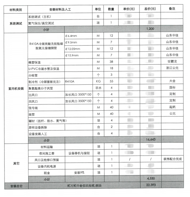 項目安裝配置價格表